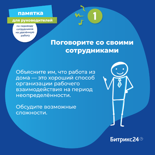 Объясните им, что работа из дома – это хороший способ организации рабочего взаимодействия на период неопределенности. Обсудите возможные сложности.